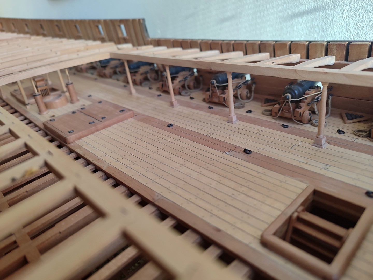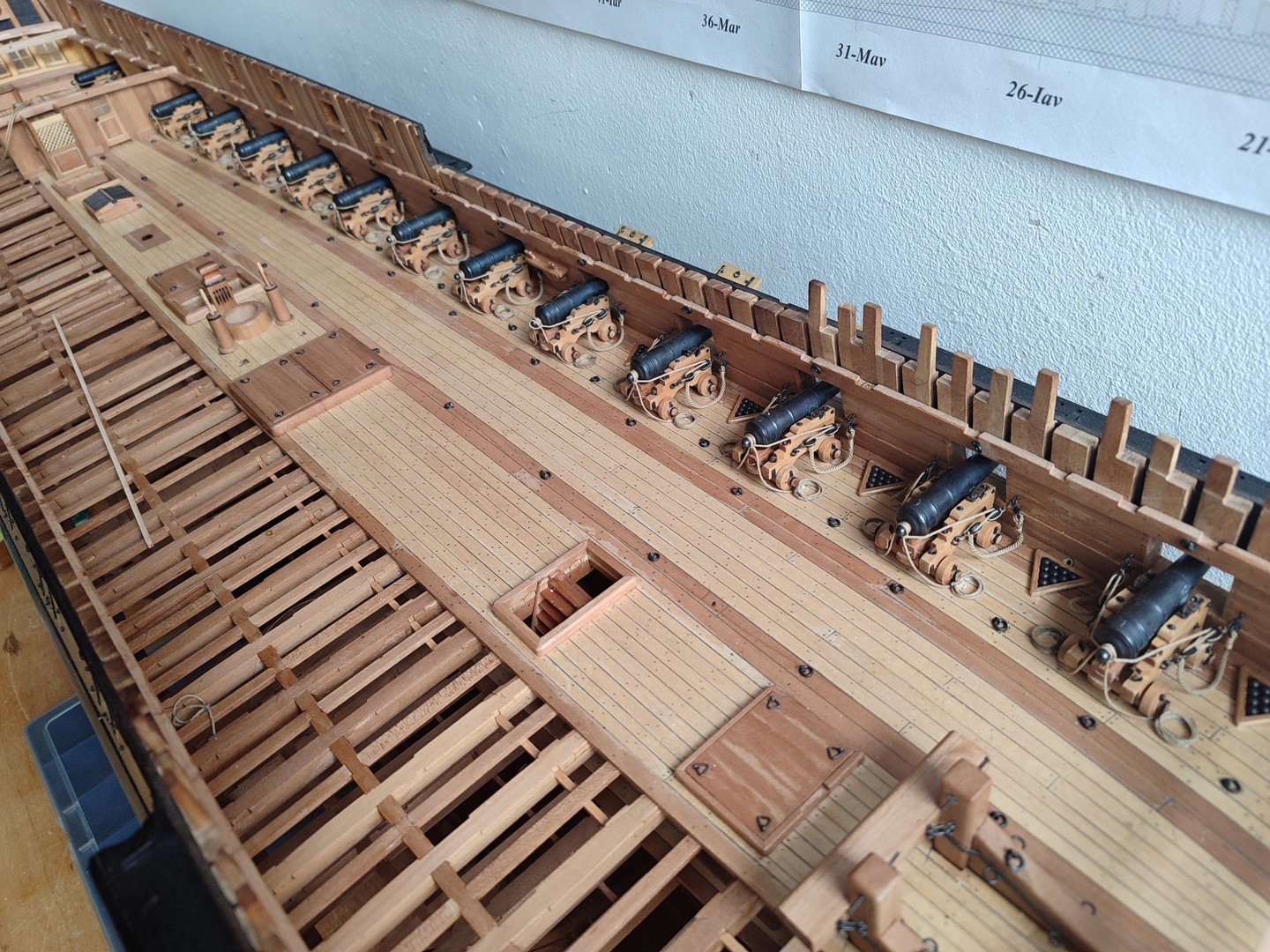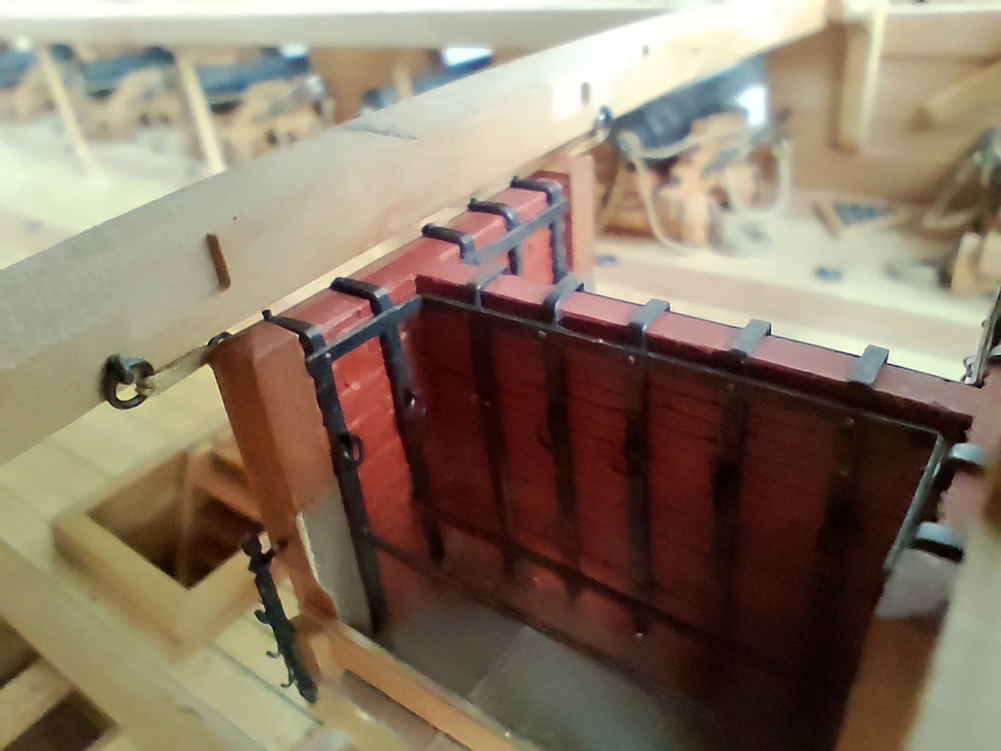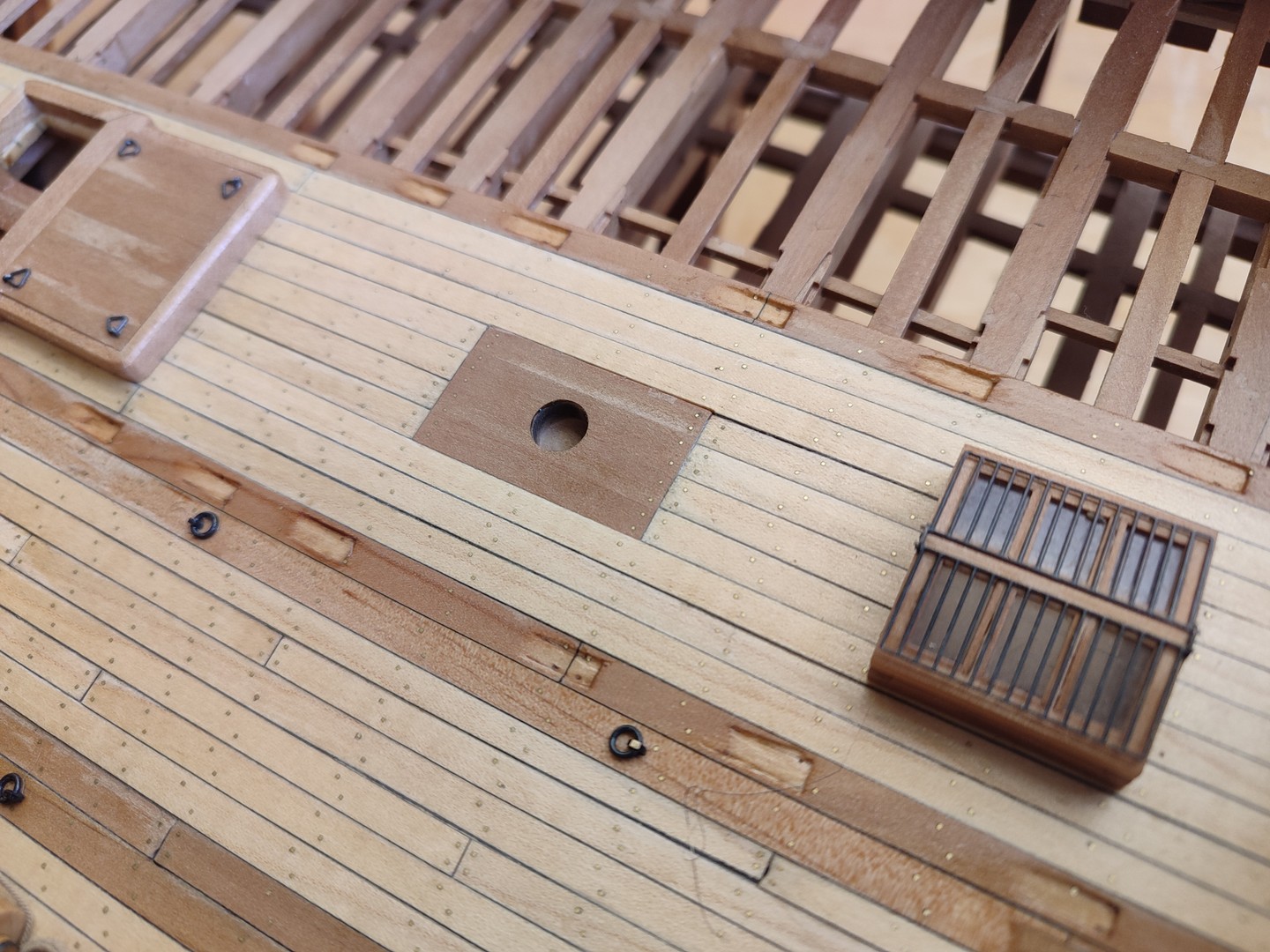 Vyrábím poklopy střílen hlavní paluby. Skládají se z vnějších vodorovných planěk, které sedí přesně v otvorech jednotlivých střílen a svislých, které jsou z vnitřní strany přibité na vodorovné a kopírují tvar zaoblení trupu. Přibité jsou zvláštními hřeby s "diamantovou" hlavou o rozměru 0,385x0,385mm.