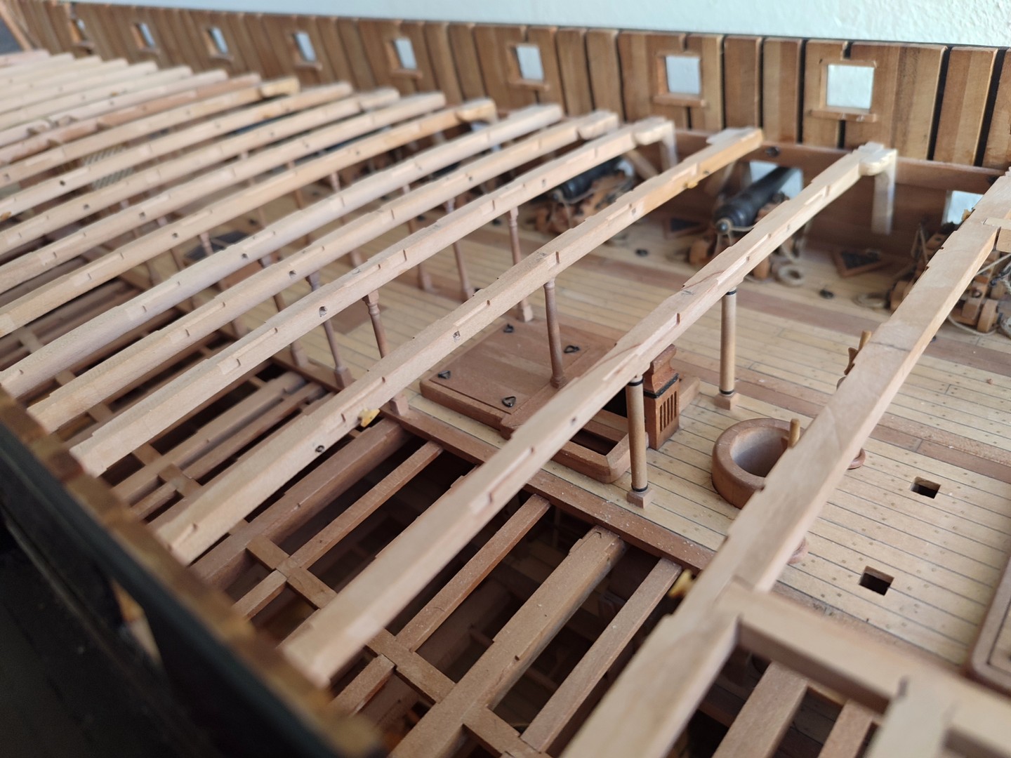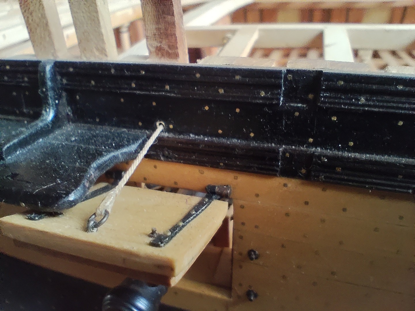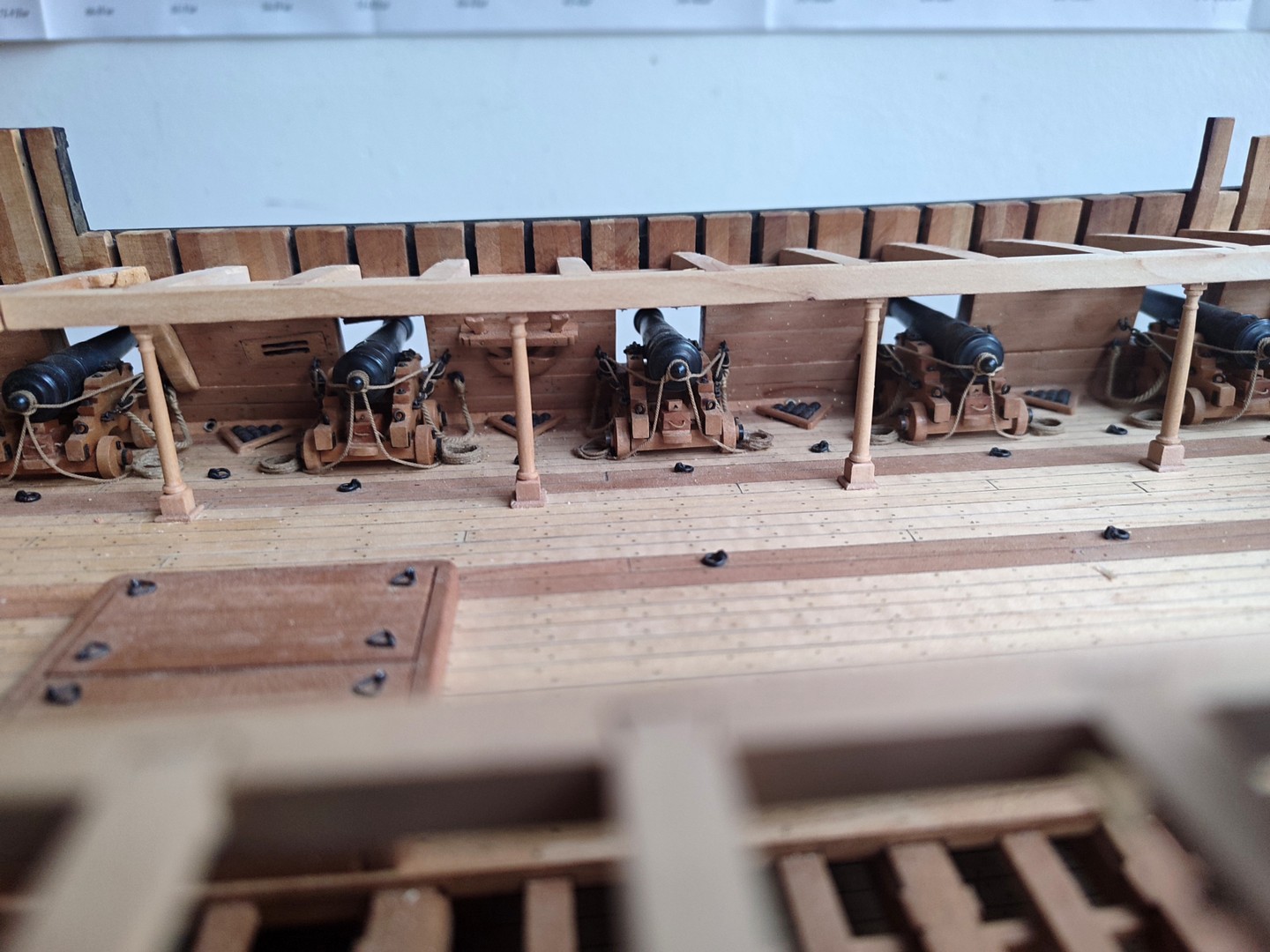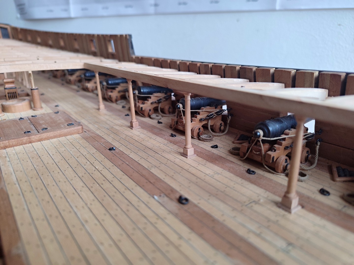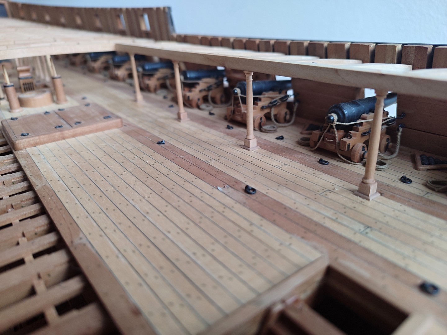 Vyrábím poklopy střílen hlavní paluby. Skládají se z vnějších vodorovných planěk, které sedí přesně v otvorech jednotlivých střílen a svislých, které jsou z vnitřní strany přibité na vodorovné a kopírují tvar zaoblení trupu. Přibité jsou zvláštními hřeby s "diamantovou" hlavou o rozměru 0,385x0,385mm.