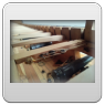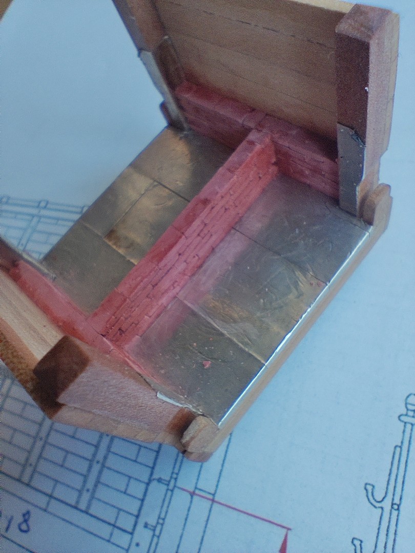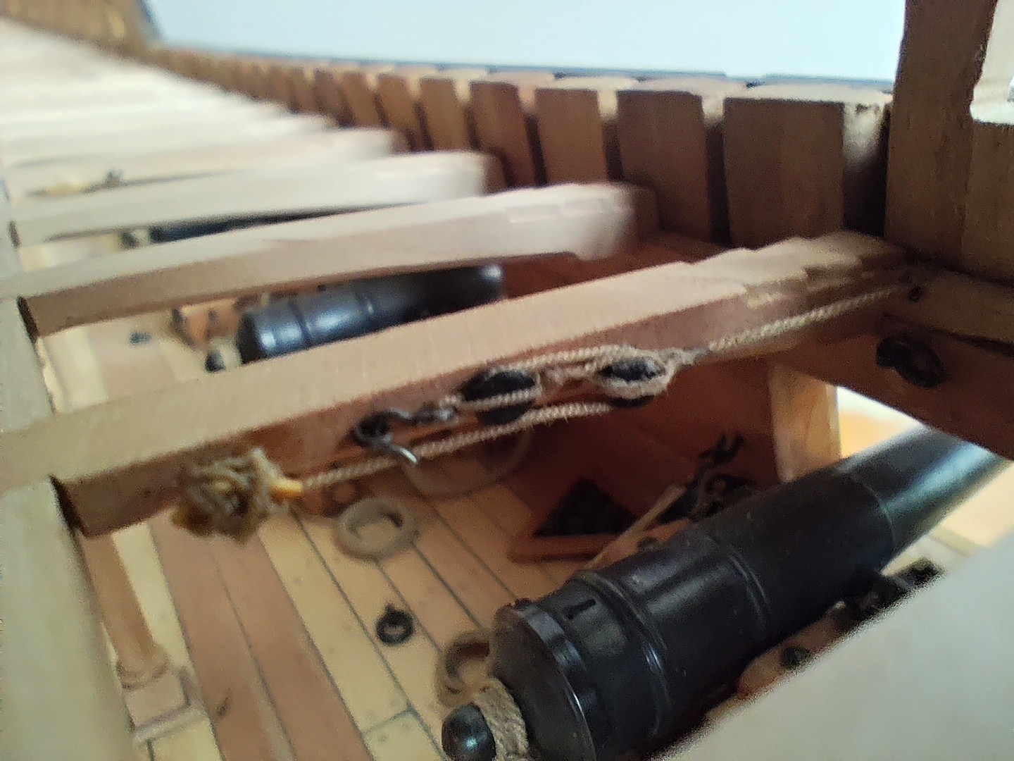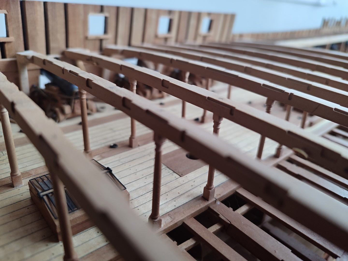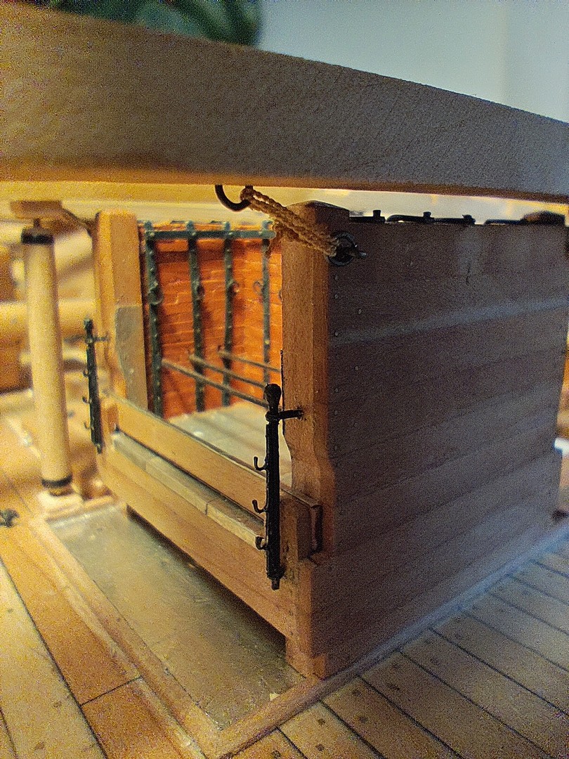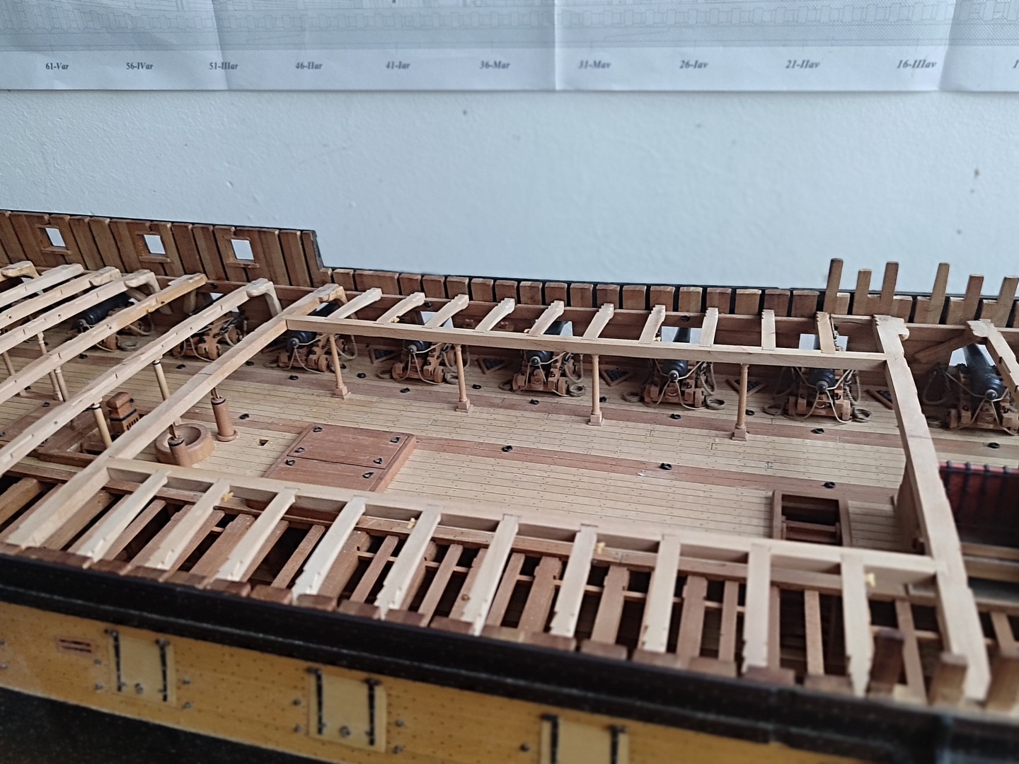 Vyrábím poklopy střílen hlavní paluby. Skládají se z vnějších vodorovných planěk, které sedí přesně v otvorech jednotlivých střílen a svislých, které jsou z vnitřní strany přibité na vodorovné a kopírují tvar zaoblení trupu. Přibité jsou zvláštními hřeby s "diamantovou" hlavou o rozměru 0,385x0,385mm.