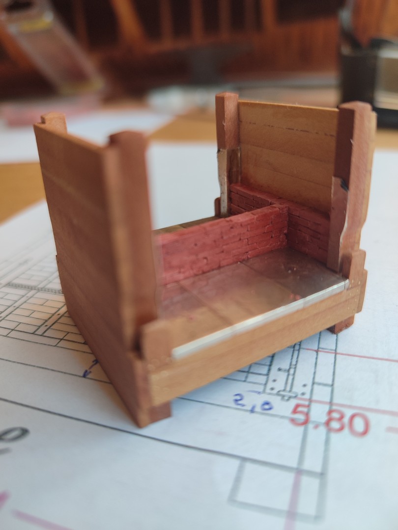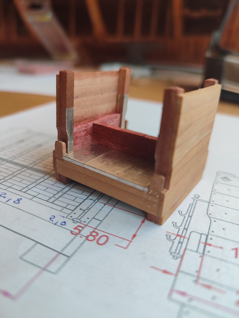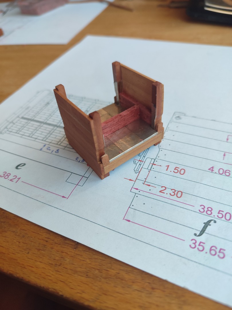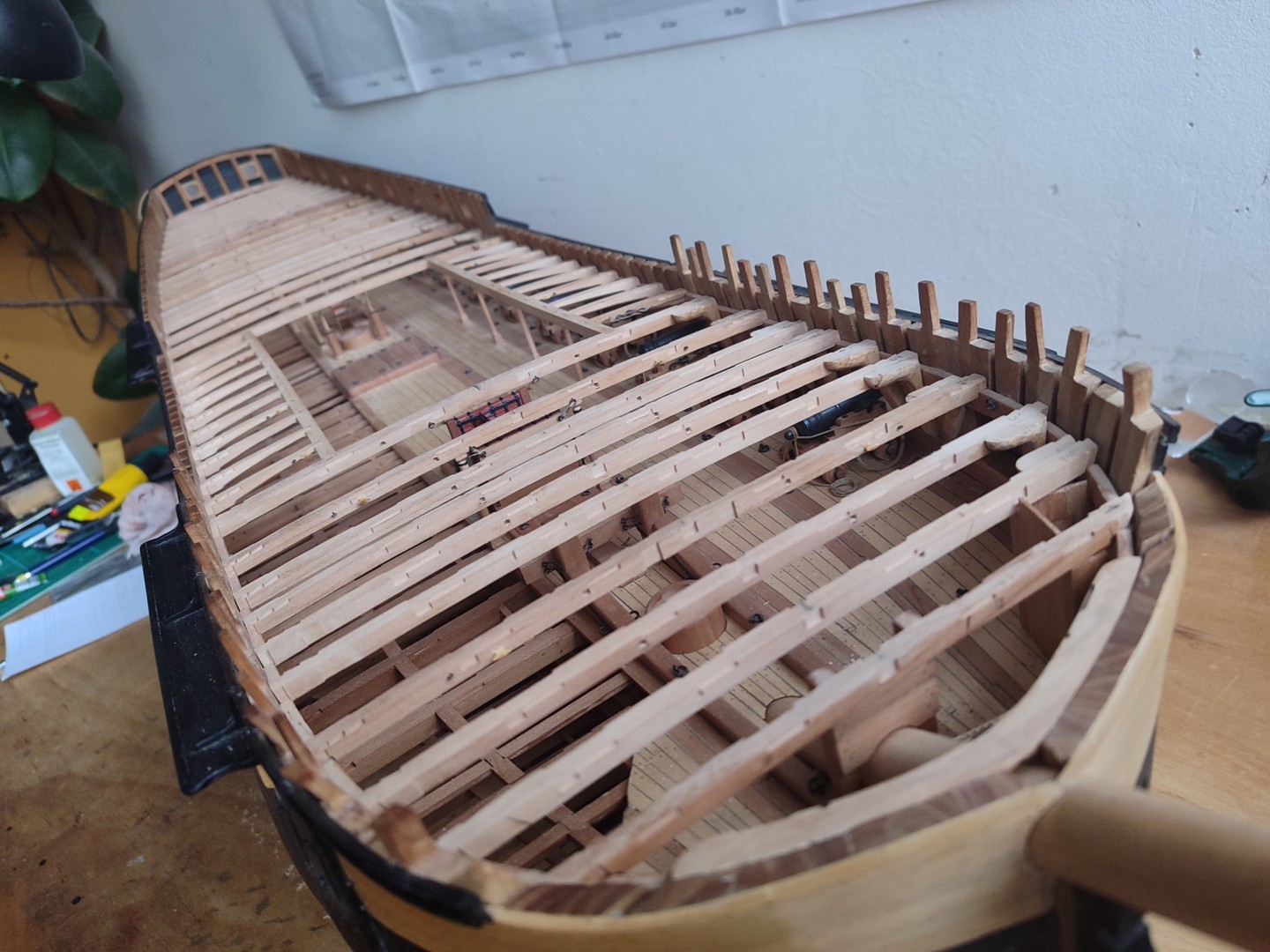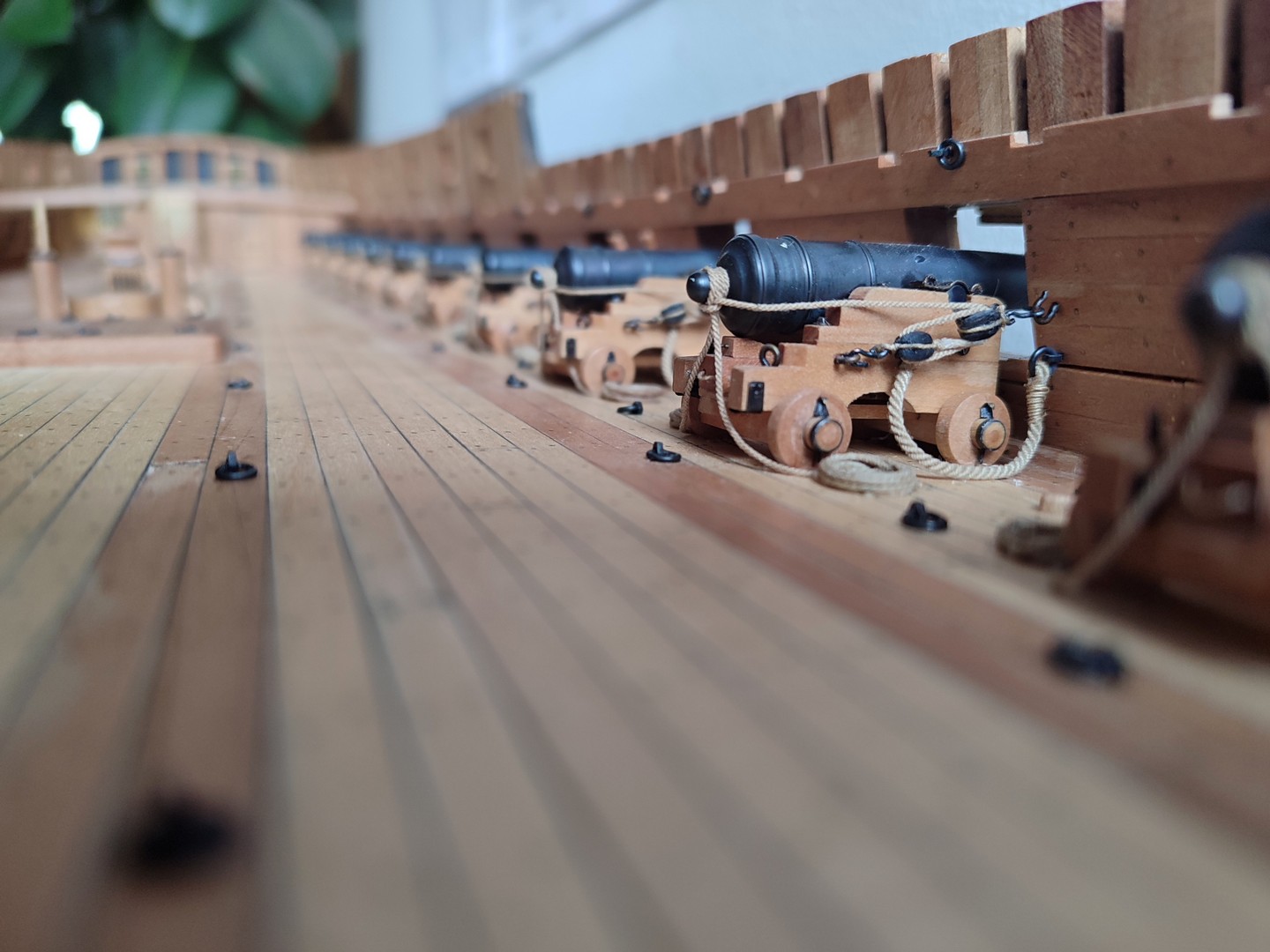 Začala výroba vnitřní vestavby - v zadní části u kýlu je místnost pro skladování střelného prachu jak v sudech, tak v kartuších, uložených v samostatných kójích. Je tam uzavřená šachta s prosklenými a zamřížovanými okny, kde byla zavěšená lampa pro osvětlení skladu.